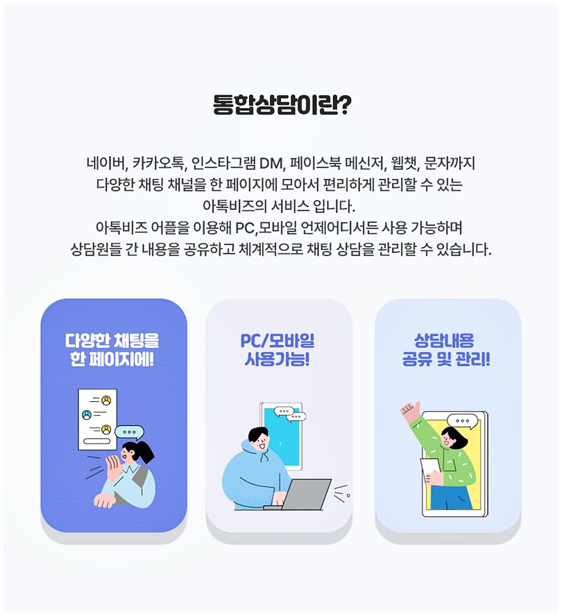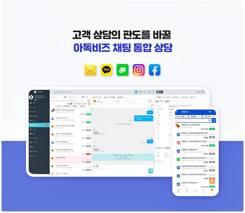 아톡비즈 통합 채팅상담은 카카오톡 채널, 네이버 톡톡, 자사 사이트 채팅, 인스타그램 DM 등 고객들이 자주 사용하는 모든 채팅 채널을 통합하여 응대하고 관리할 수 있도록 지원하며,