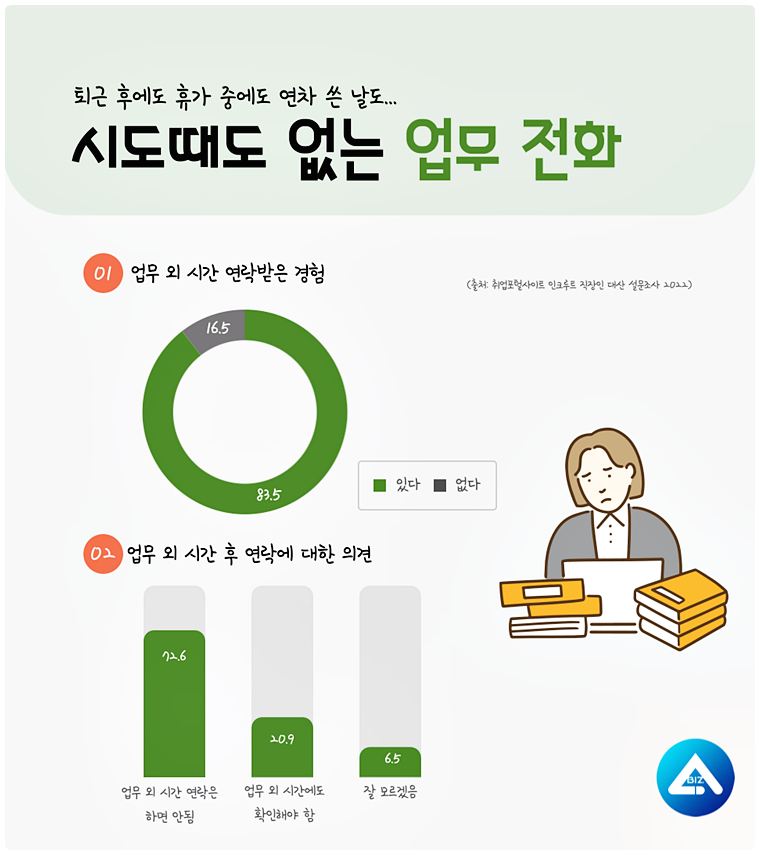 직장인 대상 설문조사에 따르면, 위 표와 같이 업무 외 시간 연락을 받은 경험이 있는 직장인이 83.5%라고 합니다.