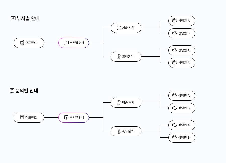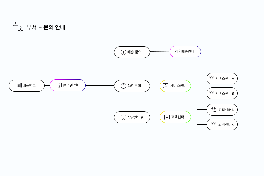 전화를 걸었을 때 해당 기업 내 여러 부서가 있고 각 부서별로 전화 응대를 하고 있다면 1번은 기술지원, 2번은 고객센터 등으로 부서 연결을 설정할 수 있어요.