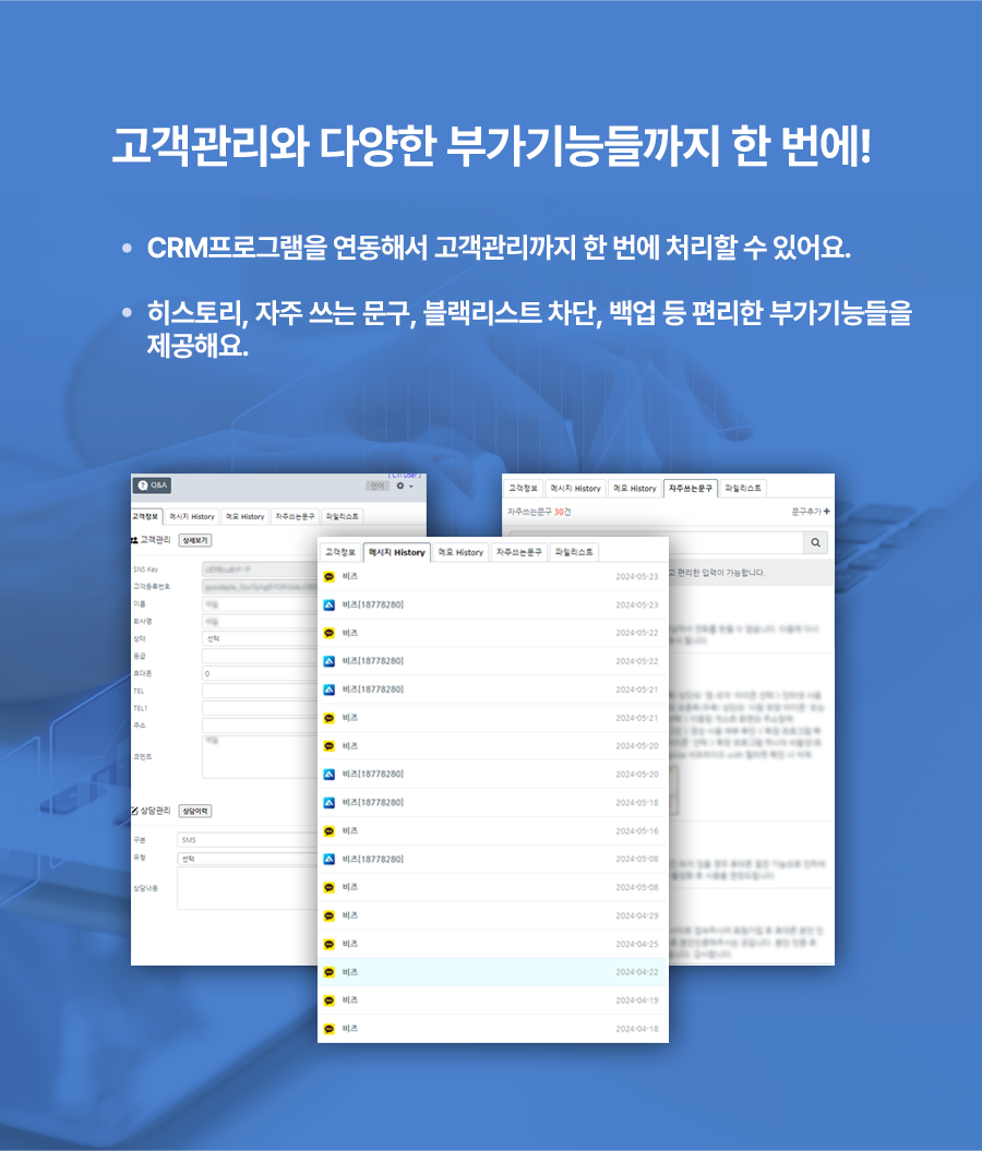 클릭하면 바로 전화로 연결되는 클릭투콜, 고객과 언제 상담을 했는지 알아볼 수 있는 히스토리 기능, 자주 쓰는 문구 설정,