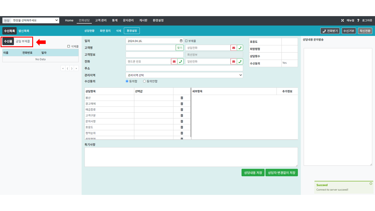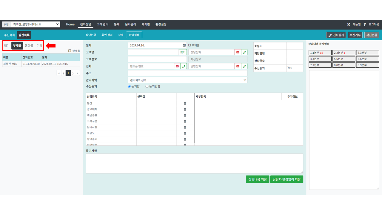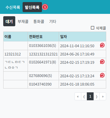 현장을 선택하면 수신목록과 발신목록을 나눠 크게 (대기/부재콜/통화콜) 로 콜을 자동 분류해요.