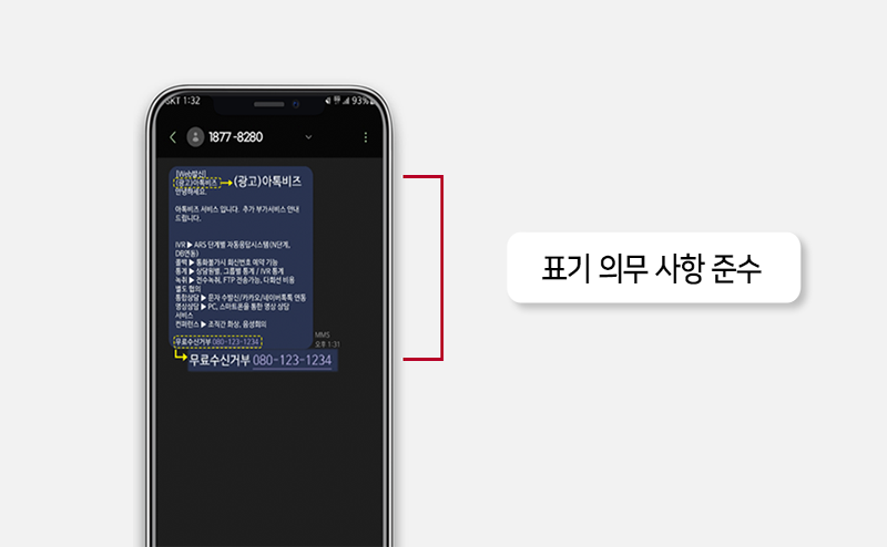 해당 내용은 광고 문자로 분류되어 080 무료수신거부 서비스를 사용하여 문자 하단에 필수적으로 번호를 삽입하여야 합니다.