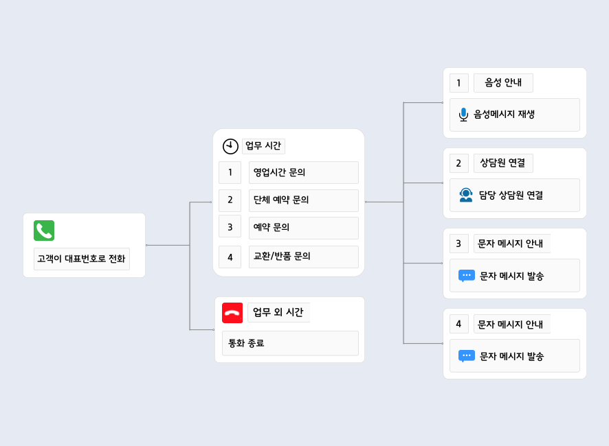 문의 유형별로 ARS 안내멘트를 구성하거나, 지점 연결, 부서 연결 등