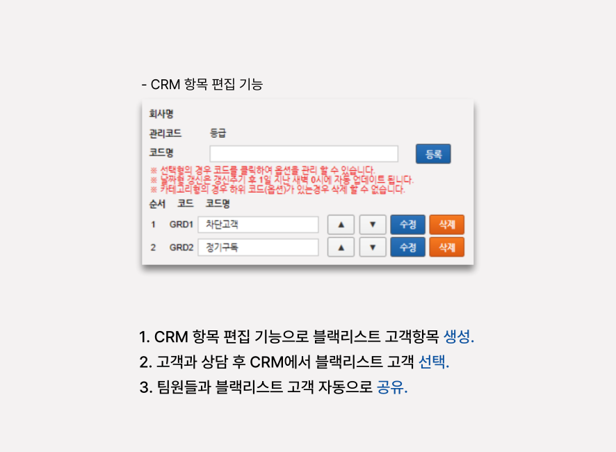 【 CRM : 블랙리스트 관리 】··········고객정보를 공유하고 블랙리스트(강성고객)도 따로 등록하여 관리할 수 있나요?