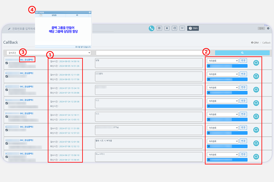 콜백 그룹에 할당된 상담원에게만 콜백 알림이 들어오며, 이력에 쌓여요.