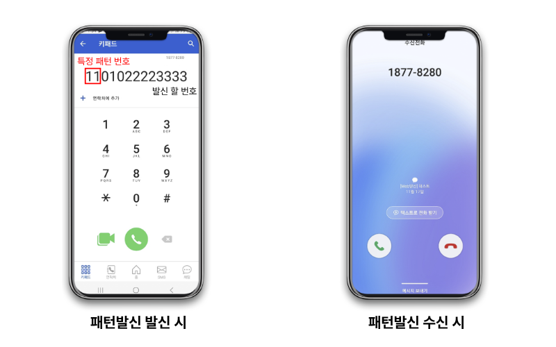 위와 같이 패턴번호 11을 사용한다면, 두번 째 이미지 오른쪽과 같이 1877-8280으로 번호가 발신 되는거죠.