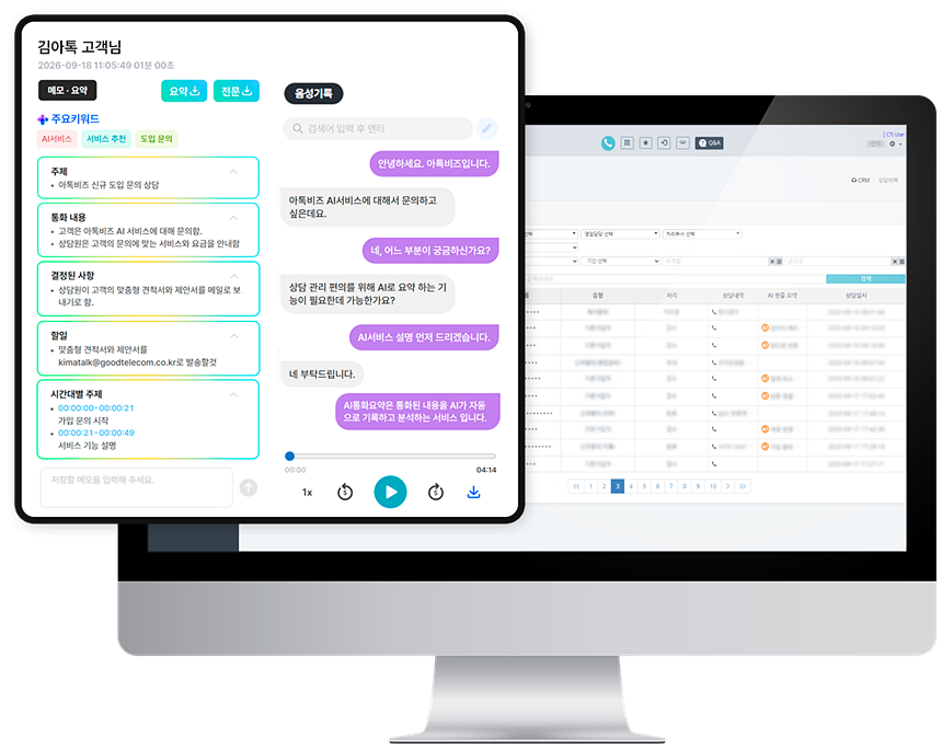 - CRM 연동: 아톡비즈 CRM 화면 내에서 고객 정보와 함께 요약본을 바로 확인할 수 있어, 다음 상담 시 이전 히스토리를 파악하는 속도가 비약적으로 빨라집니다.