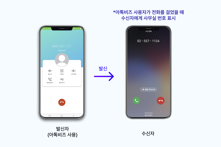 발신자가 App을 통해 전화를 걸었을 때 수신자의 화면 내 발신자의 사무실 번호가 표시 됩니다