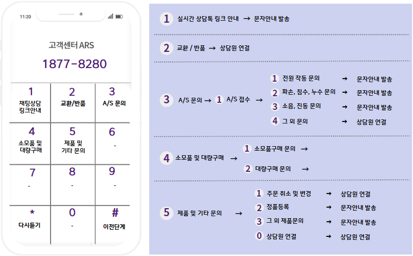 회사 대표번호로 전화 연결 시 문의내용에 맞는 번호를 선택하면서 그에 맞는 안내멘트와 안내 문자를 발송하여 고객응대를 할 수 있습니다.